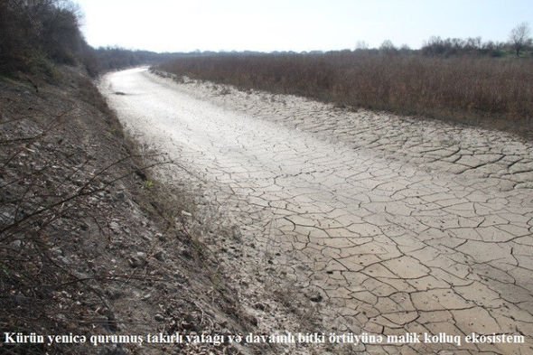 Alimlər aran regionunun digər ərazilərinə nisbətən Kür çayının Salyan və Neftçala rayonları ərazisindən keçən hissəsində şirin su qıtlığının daha kəskin vəziyyət aldığını müşahidə ediblər. Kür çayı quruyub, yatağında axımı olmayan kiçik gölməçələr qalıb. Çay yatağında davamlı bitki örtüyünə malik landşaftlar geniş sahədə quruyub, takırabənzər yataq əmələ gəlib. Kürün dənizə açıldığı yerdə süni bəndin tikilməsi ilə çay və dəniz ekosistemləri arasında mübadilə tamamilə dayanıb. Bu hissədə Kür suyunun səviyyəsi dənizdən 1,6 m aşağı düşüb.