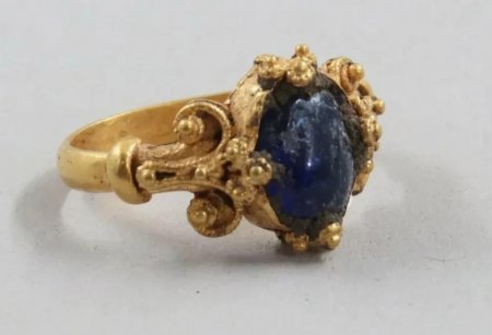 Üzük qızıldan hazırlanıb, mavi rəngli, oval formalı, ehtimal ki, sapfiri imitasiya edən şüşə daşla bəzədilib, həmçinin filiqran və qranulyasiya üsulları ilə zəngin dekorasiya olunub.